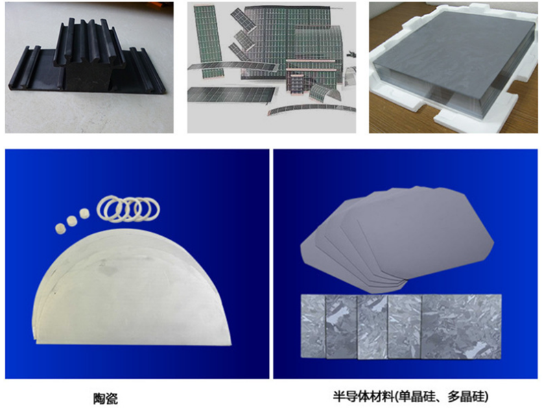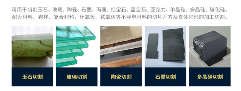 本加工方法是對電火花切割機床難以加工的不導(dǎo)電材料的補充。原則上對導(dǎo)電和不材料只要硬度比砂線小均可加工,對用電火花線切割機床加工難以加工的石墨材料,采用本產(chǎn)品加工尤能顯示其無比的優(yōu)越性;對脆性材料如注塑泡沫材料、復(fù)合材料、陶瓷、環(huán)氧板、鐵氧板、半導(dǎo)體材料、碳化硅、耐火磚、非導(dǎo)電材料等具有一定脆性材料的成型切割均可加工。